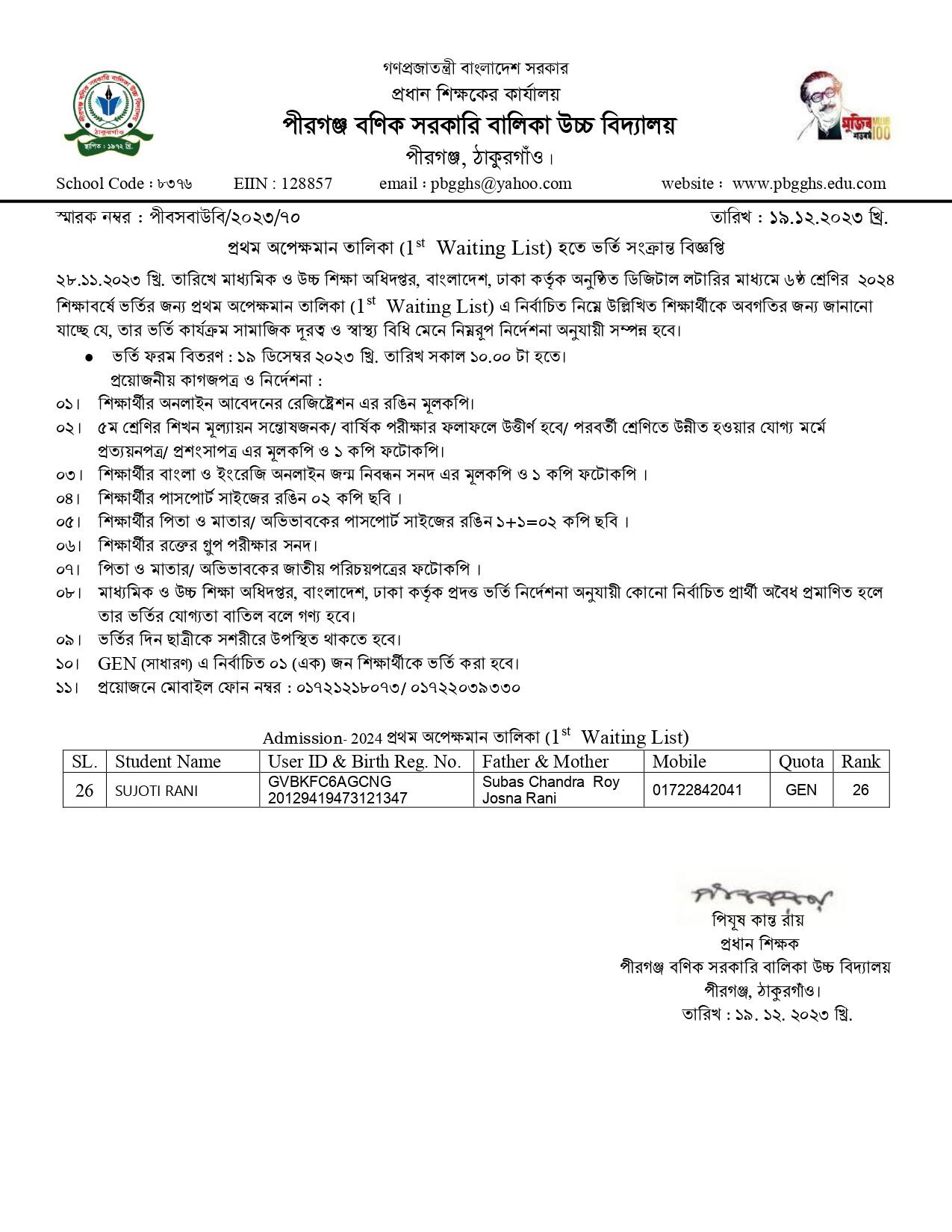 ২০২৪ শিক্ষাবর্ষের প্রথম অপেক্ষমান তালিকা হতে ভর্তি সংক্রান্ত বিজ্ঞপ্তি