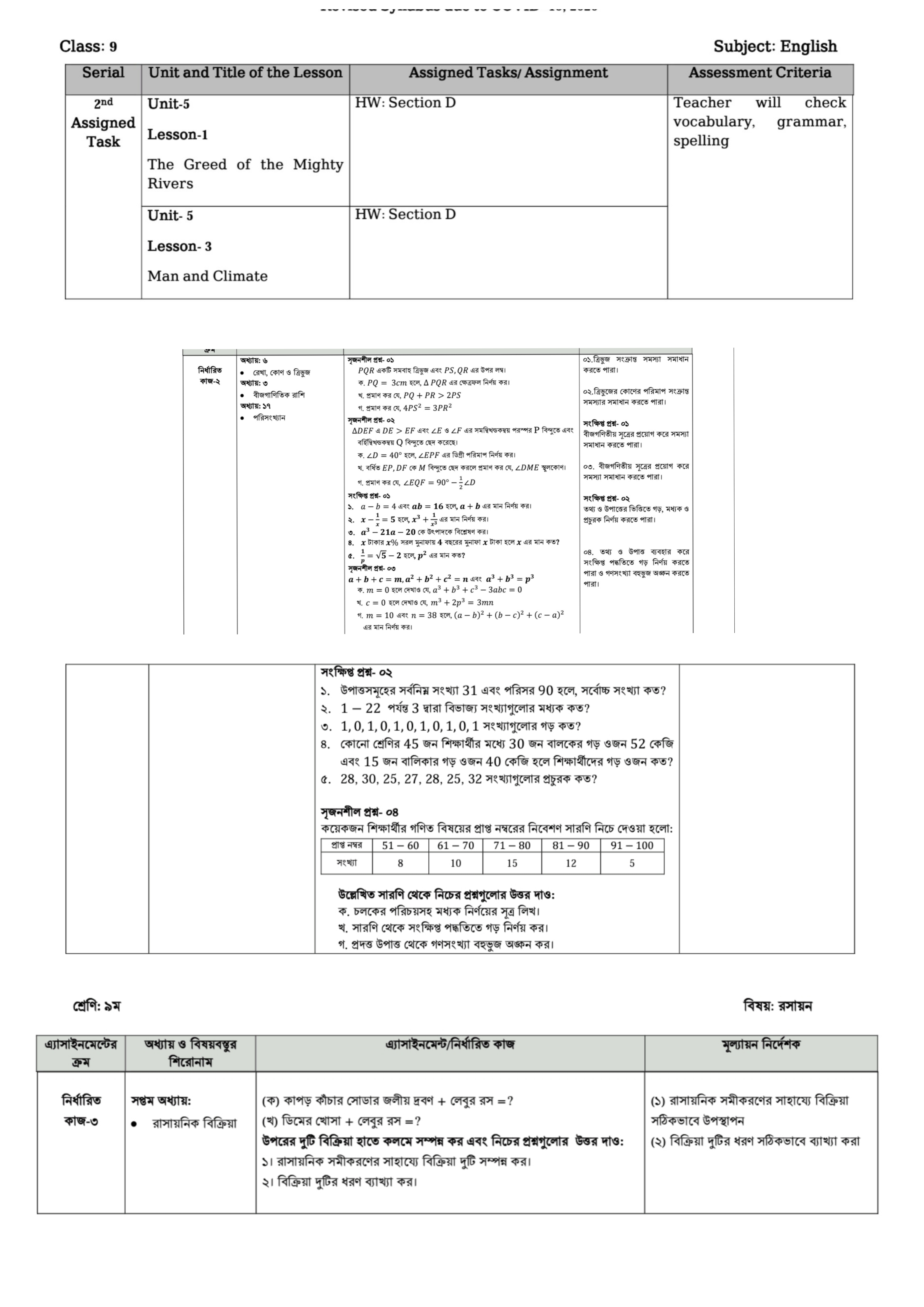 নবম শ্রেণির বার্ষিক সিলেবাস