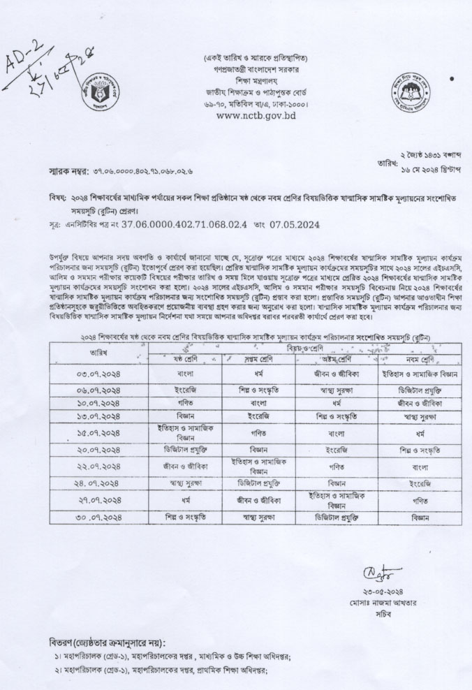 ষষ্ঠ থেকে নবম শ্রেণির বিষয়ভিত্তিক ষান্মাসিক সামষ্টিক মূল্যায়নের সংশোধিত সময়সূচি (রুটিন)
